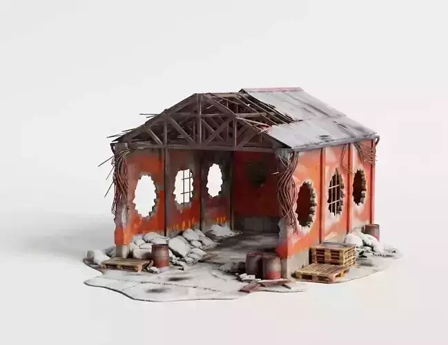 Description: Create a compelling combat zone with this Destroyed Industrial Warehouse 3D Model. This asset represents a dilapidated brick structure that has suffered heavy structural damage, featuring collapsed roofing, large impact holes in the walls, and exposed rebar. The scene is set in deep winter, with snow covering the debris, floor, and remaining roof sections. Scattered oil drums and wooden pallets add to the atmosphere of abandonment, making it ideal for cover systems in shooters or shelters in survival games.