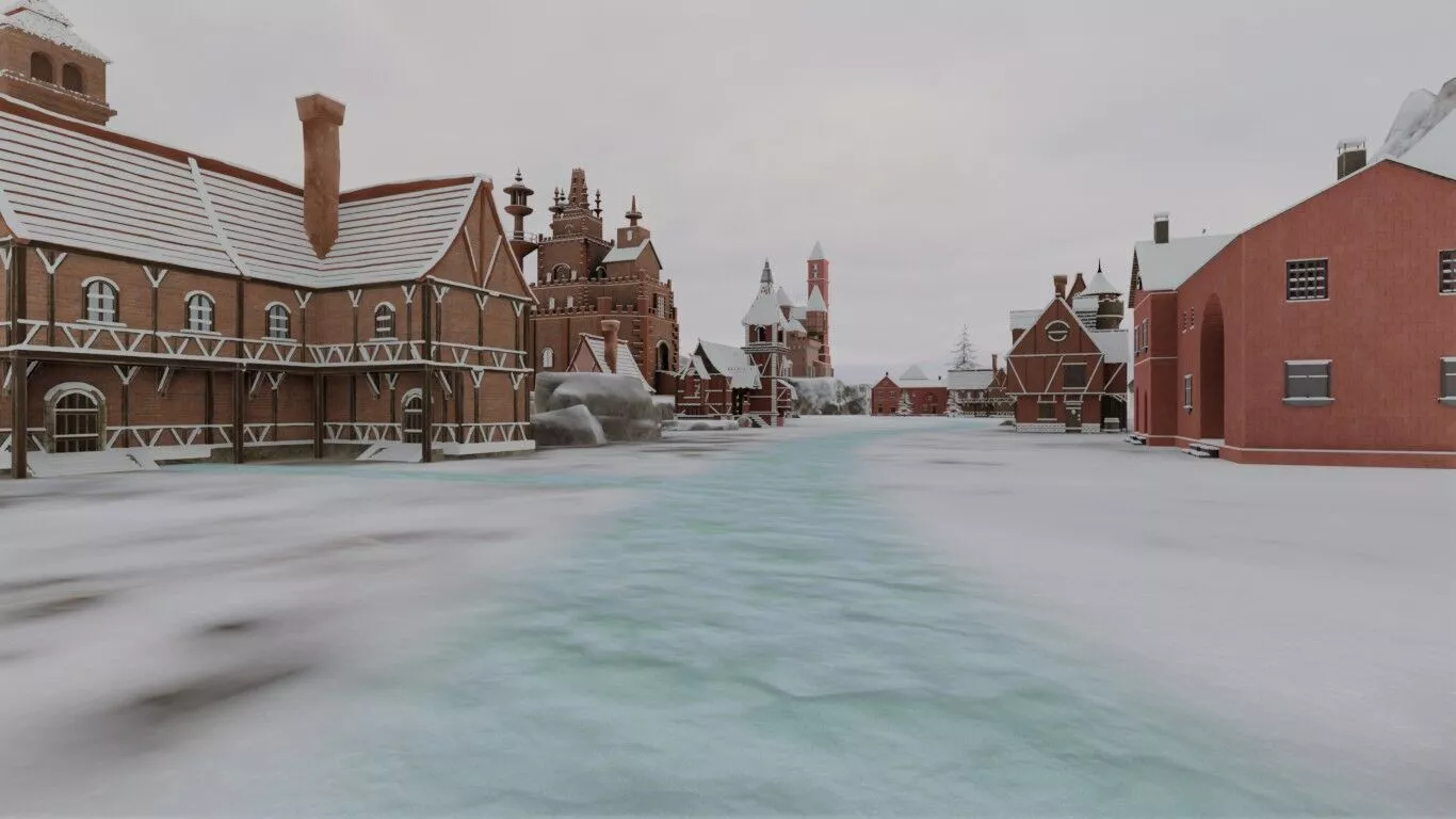 A snowy mountain village with medieval-style buildings, towers, and icy paths winding through a frozen alpine landscape, rendered in a stylized art style. In a snow-softened, wintry light, the scene feels frigid and exposed, its cool, muted tones underscoring the mood throughout.