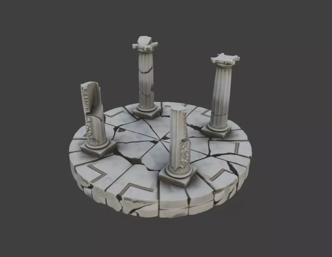 Narratively, the Stone Base with Three Crumbling Pillars suggests themes of lost knowledge, fallen empires, and the passage of time. It can represent a collapsed altar, an ancient ceremonial platform, or the remnants of a once-grand monument. Artists can enhance storytelling by adding vegetation, debris, magical effects, or environmental storytelling elements around the structure.