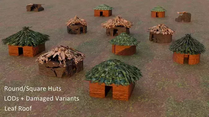 A complete collection of 12 African-style huts, featuring square and round designs, each with clean and damaged versions and 3 LOD levels. Fully game-ready, optimized for real-time projects, and suitable for Unity, Unreal Engine, and other engines. The roof Is made of leaf as the key stylization.Total of 55000 tris and 34000 verts ( All 12 huts together) Max of !!,000 tris for LOD0.