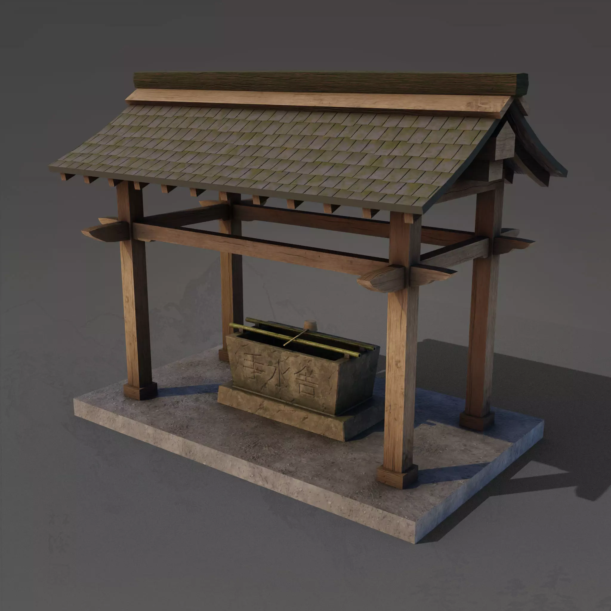 Chōzu-ya or temizu-ya (手水舎, ちょうずしゃ、てみずしゃ) is a Shinto water ablution pavilion for a ceremonial purification rite known as temizu or chōzu (手水; lit. hand-water). The pavillion contains a chōzu-bachi (手水鉢; lit. hand water basin). There are many types of chōzu-bachi; for instance, a low chōzu-bachi, with attendant stones, is called a tsukubai and is often found in tea-gardens. Chōzu-bachi are usually stone, but may be made of other materials, such as ceramic or bronze.