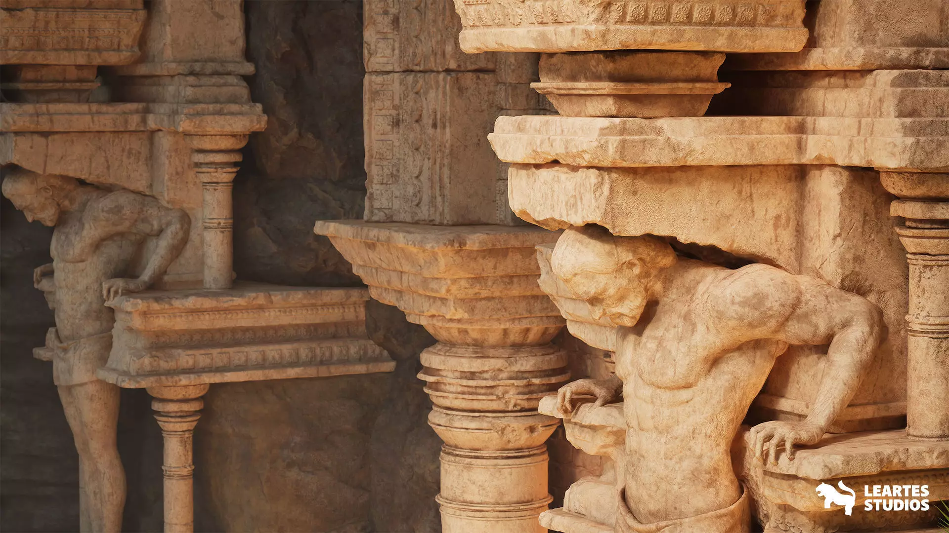 - AAA-quality modular ancient temple architecture: Detailed pillars, carved stone elements, platforms, statues, and ruins.