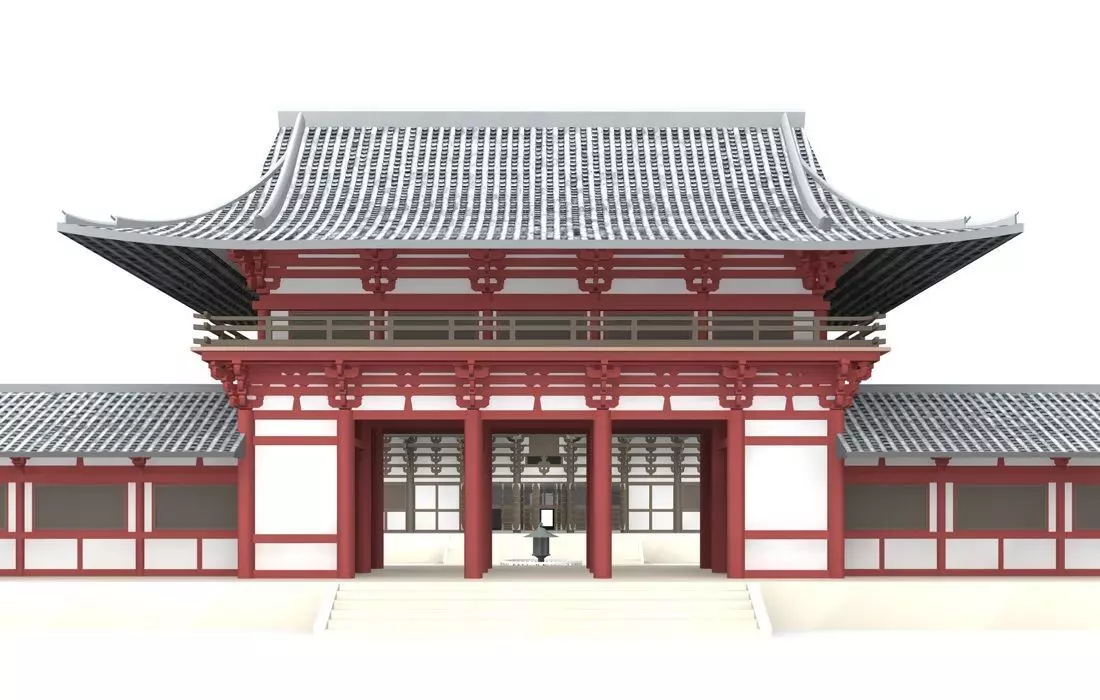 As an important place of worship, many millions were involved in the construction of Nara’s religious buildings. The giant buddha housed in the great hall required over 300,000 labourers to complete; the amount of valuable bronze included in this statue crippled the Japanese economy at the time. This hall is rendered perfectly by this 3D model. This great hall has been rebuilt several times through history due to fire damage. The courtyard features today and in this 3D model are very much akin to the original features of the finished 752AD building. The current hall was built in 1709 and was the largest wooden building until 1998, when it was succeeded by numerous buildings, including Japan’s own Odate Jukai Dome (a baseball stadium). Not included in this 3D render are the original two pagodas which used to be included on this site. These were destroyed in an earthquake, as were many of the complexes original features. Extensive restoration to the area’s buildings was undertaken throughout the 1980s and 1990s. Because of the advantages of modern X-Ray technology, relics have been found hidden in the knees of the bronze Buddha.