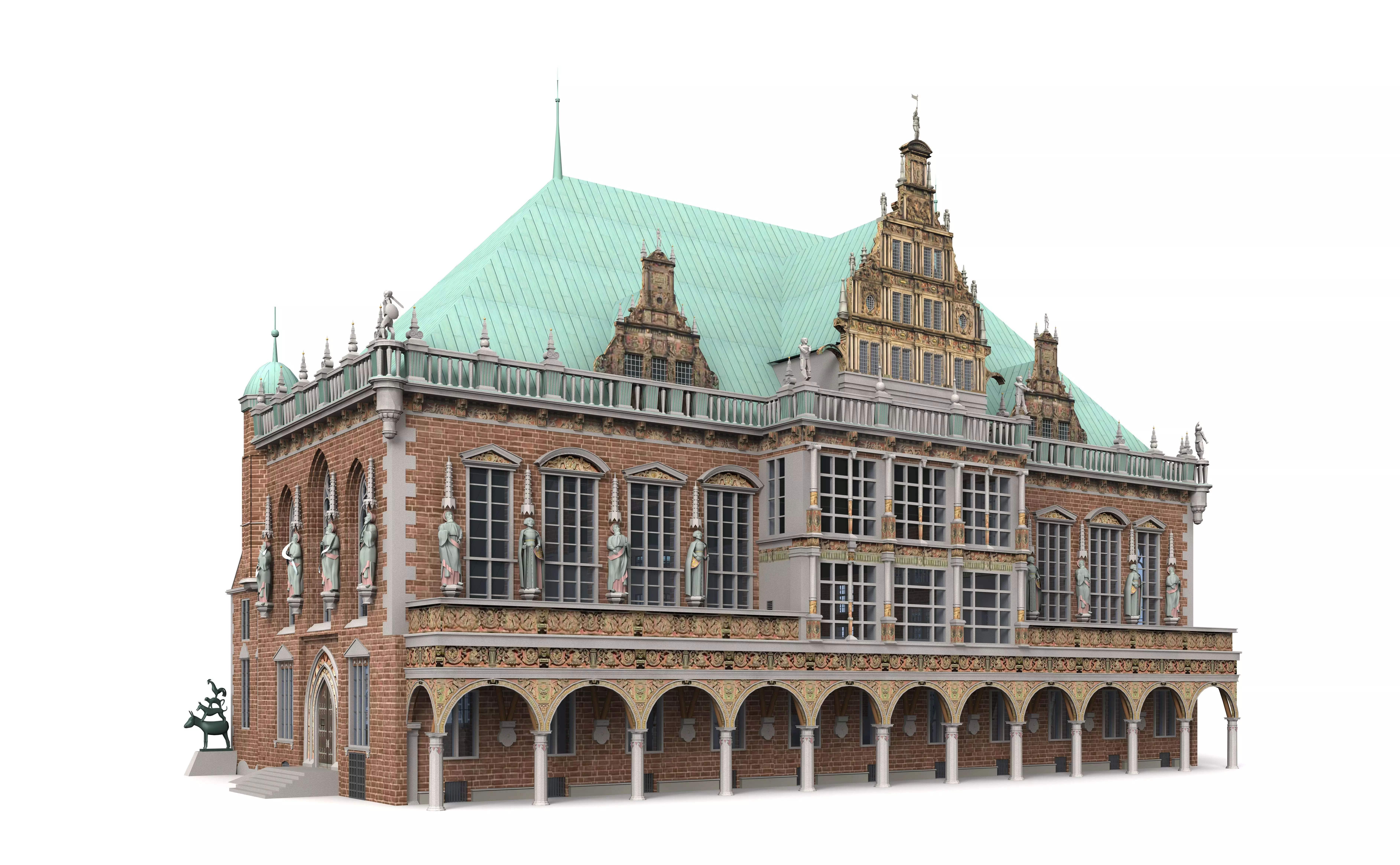 The instant download of the 3D building models shows the fine 17th century façade in all its beautiful glory along with the side and rear views. The 3D model also shows the Bremen Town Musicians, a statue featuring the donkey, dog, cat and cockerel from The Brothers Grim tale. Added to the west of the city hall in 1951, this sculpture by Gerhard Marcks, is very popular with tourists who visit this incredible square in Bremen.