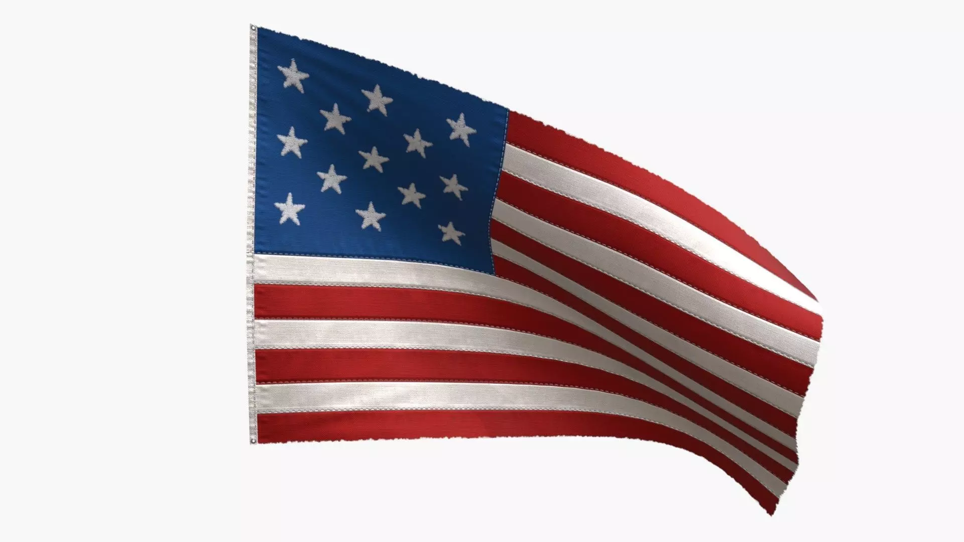 The 3D model of the first American Flag used from 1776 to 1795 including 13 stars. The model includes 3 materials for clean version, dirty version and bloody version. The model includes 3 variations of textures with the classic aligned stars, the circle stars configuration named Betsy Ross and the other circular star configuration named Cowpens with a central star. All stars are in embroidery floss and many details as folds and wrinkles around all seams to get the most realistic fabric effect.
