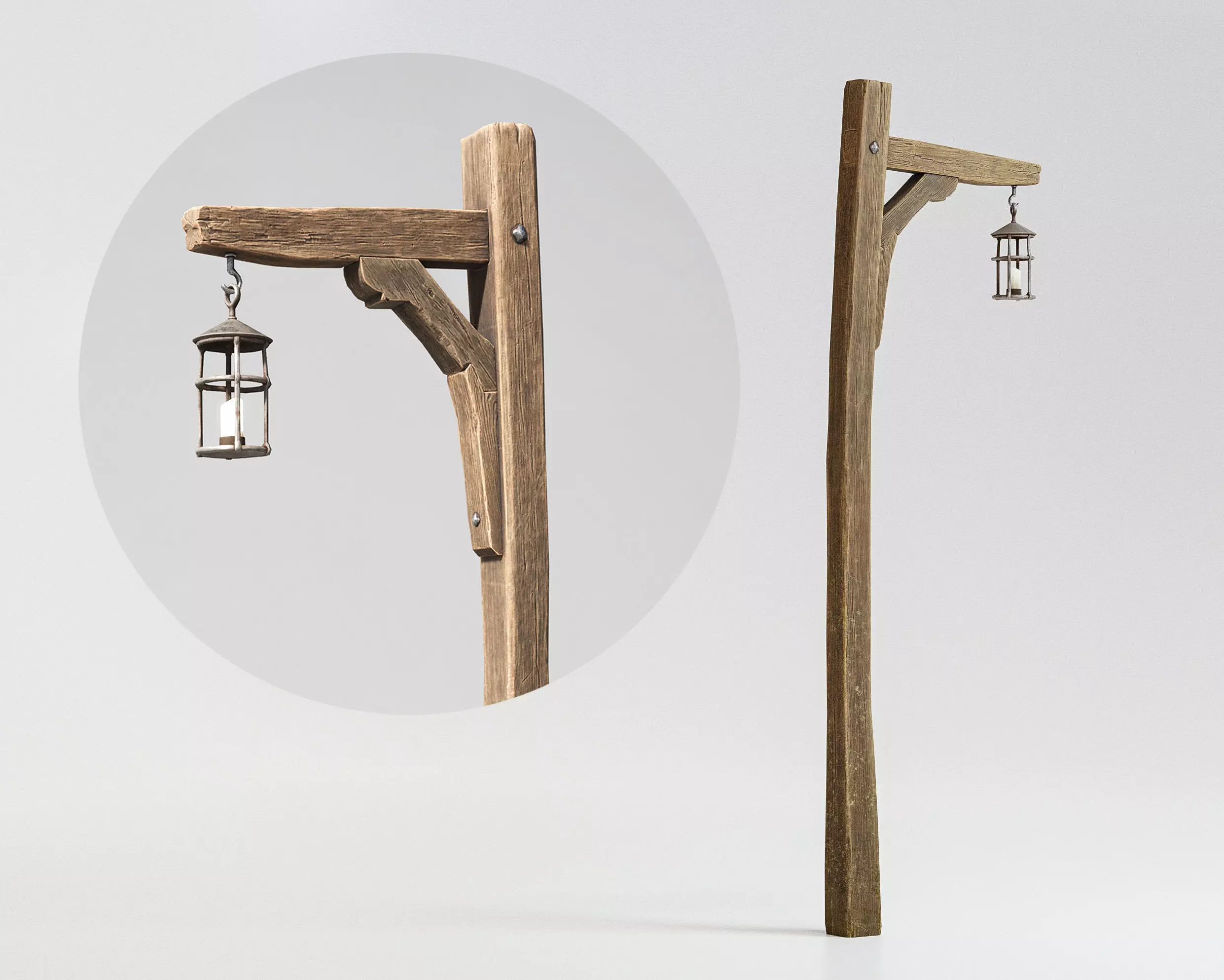 Wooden lamppost materials: 3 sets of PBR textures - diffuse, metalic, roughness, (OpenGL and DirectX) normal, ambient occlusion + packed Unreal Engine - occlusion, metallic, roughness map.
