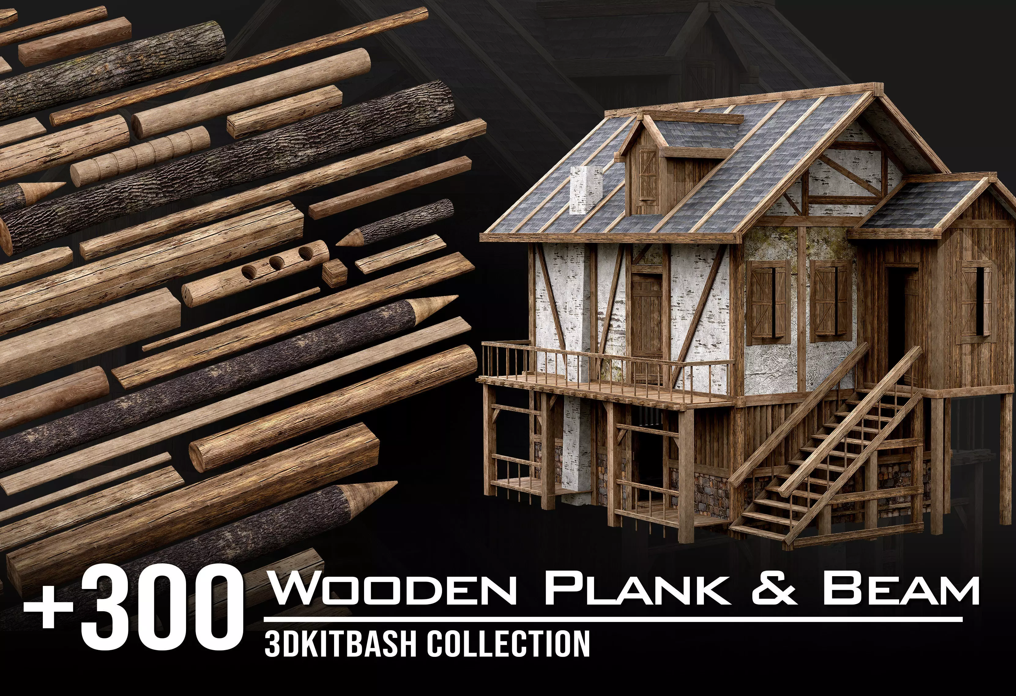 A versatile collection of wooden planks and structural beams, ideal for building realistic environments ranging from rustic cabins to medieval towns or modern construction sites.