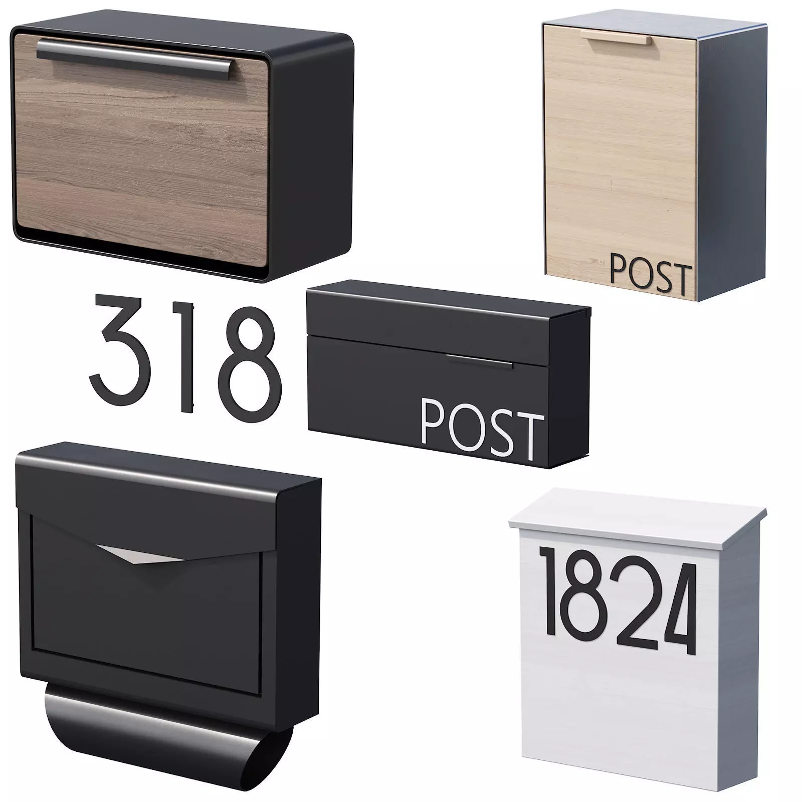 3d model 5 modern wall-mounted mailboxes in a minimalist style, suitable for use in exterior, interior, urban environments.Materials: Metal, brushed aluminum, polished metal, brushed ferrous metal, walnut wood, oak wood, white wood.