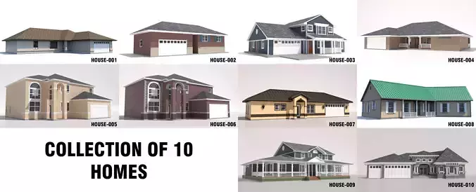 -Each model can be purchased seperately (See Below)-Each Home is Modeled to Scale and Dimensions, see below.-Each Home is Modeled in 3ds Max 2015, rendered using Vray.-Interiors of each home are NOT modeled.-All Objects are grouped into 1 group for easy scene movement and placed at 0,0,0 Axis.
