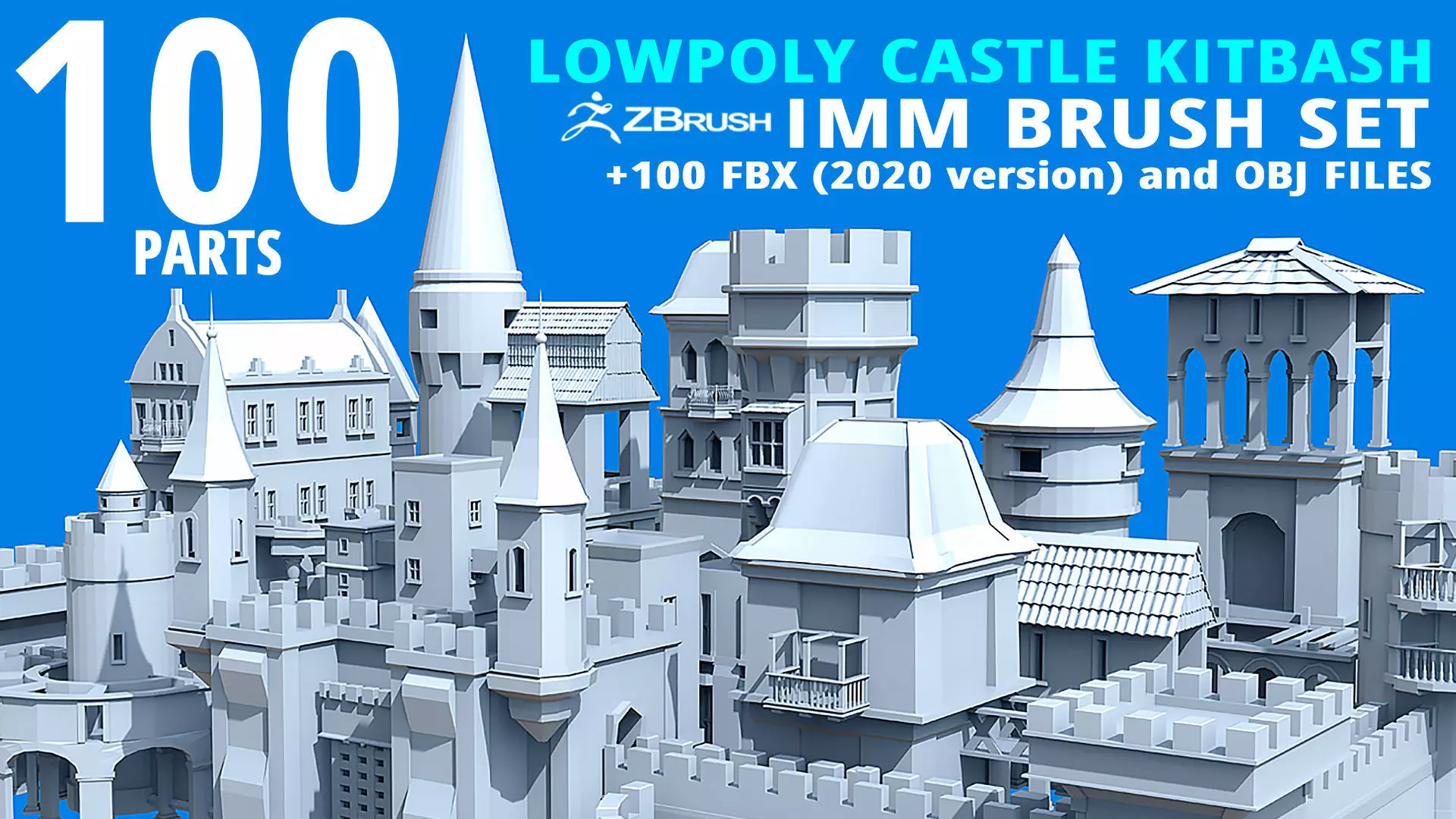 100 Low-poly medieval fantasy castle and fortress kitbash IMM Zbrush brush set, obj and fbx files.
