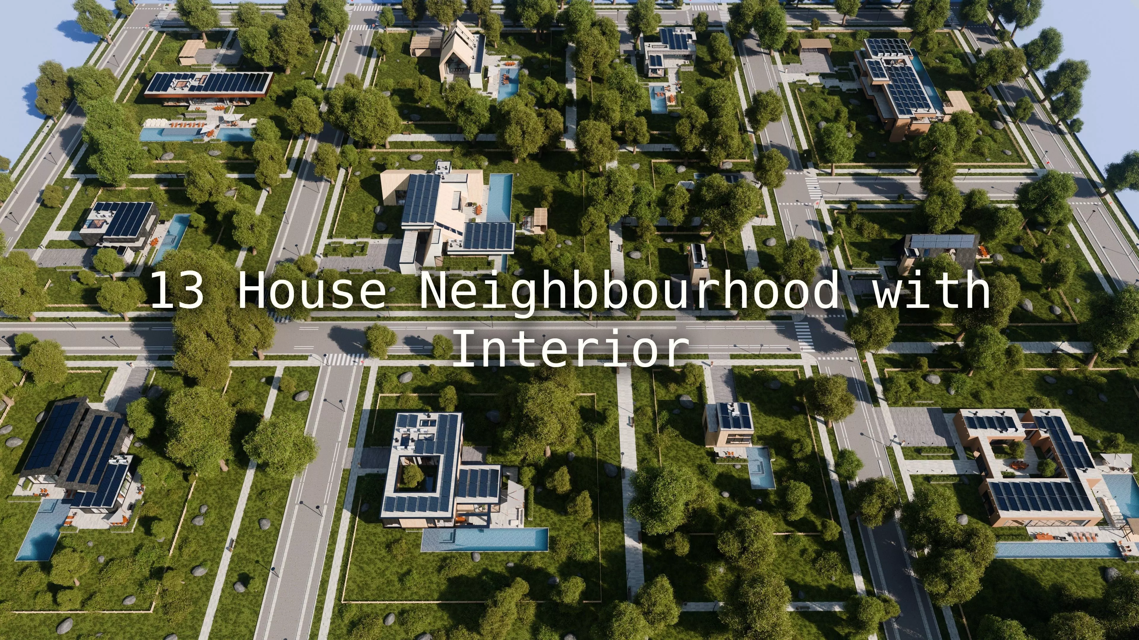 This is a neighborhood containing 13 modern modular houses with fully furnished interiors for Blender Eevee and Cycles.
