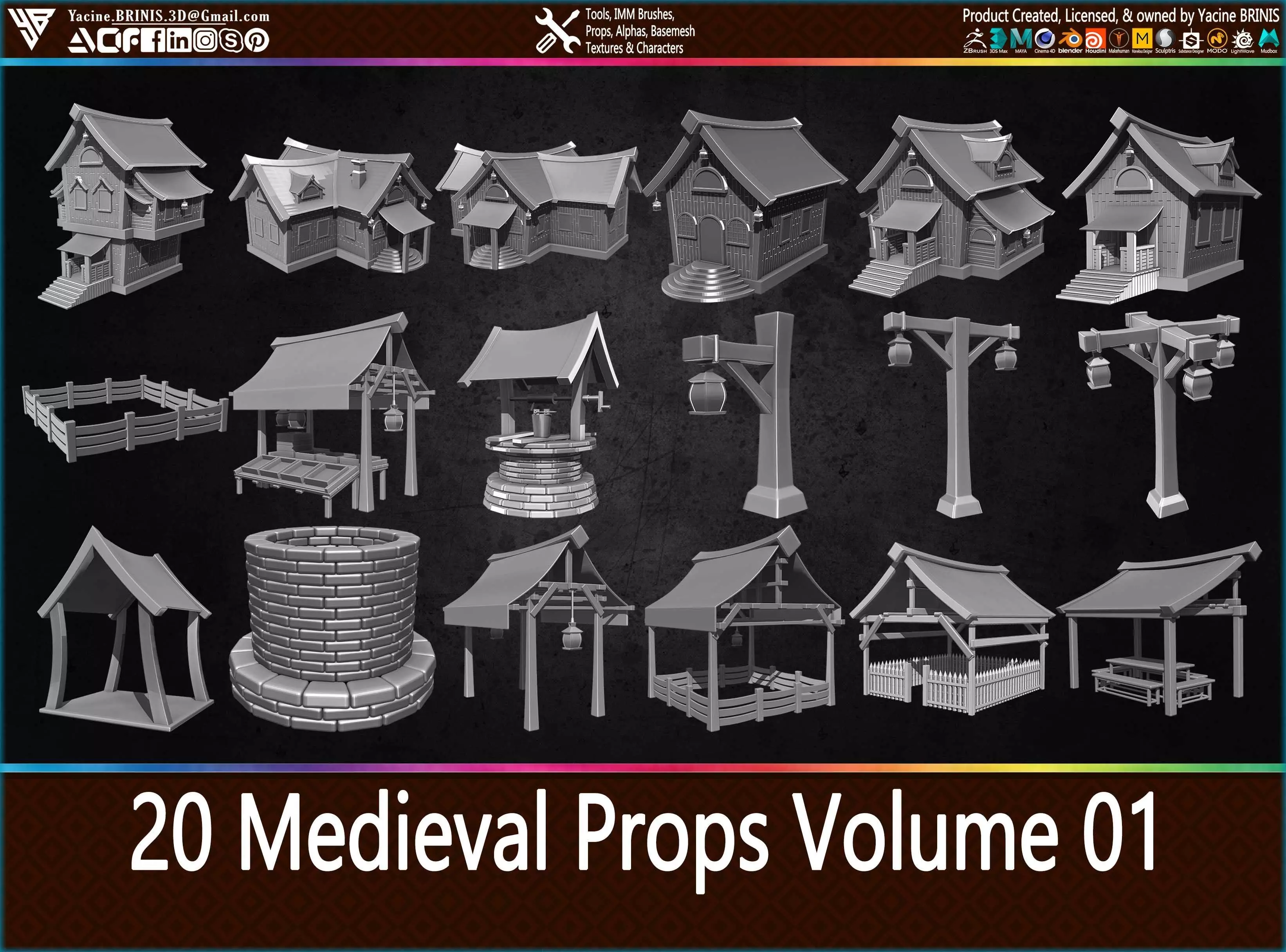 This is a pack of 20 Medieval Village Props you can use for your scenes on your 3D Software, on a scene for your game, show, reel, and 3d Print.