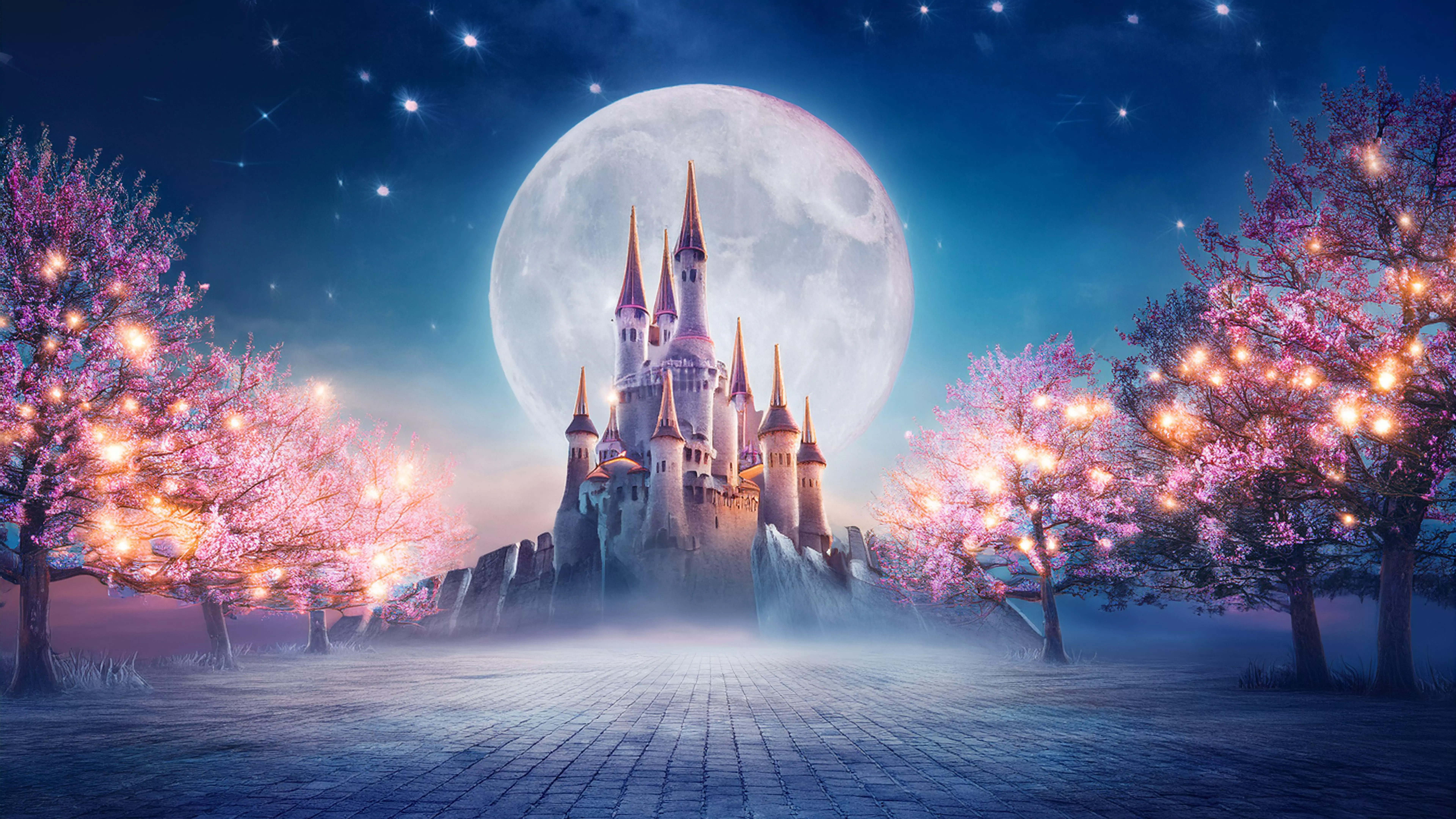 A 3d background (8k) of the Fantasy castle Rose Dream on a plane for your next 3d film or 3d video project. The 3d models were crafted by hand in Blender, the image was created with a special prompt in Photoshop (image generator).