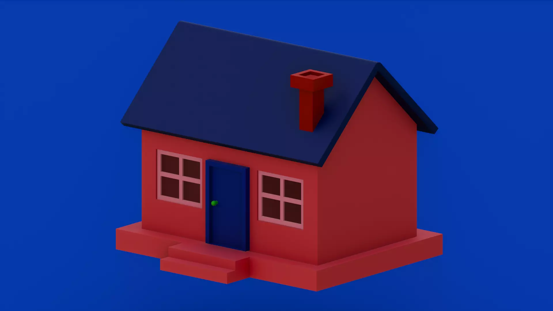 This is a simple and aesthetically pleasing 3D house model created in Blender, following a toy-like low-poly style with a clean and minimalistic design. The house has a rectangular base that gives the impression of a foundation. The walls are a vibrant red or maroon color, making the structure stand out. The dark blue roof creates a strong contrast, adding depth to the model. There are square windows on both sides with light pink frames, complementing the overall color scheme. The door is a deep blue shade with a small green knob, adding a subtle detail to the entrance. A small red chimney sits on top of the roof, giving the house a cozy feel. In front of the entrance, there are small red stairs, making the model more realistic. The background is a solid blue, which highlights the colors of the house. This model is beginner-friendly, using simple geometric shapes and a low-poly aesthetic. It can be further enhanced with textures, lighting effects, or additional details for a more refined look!