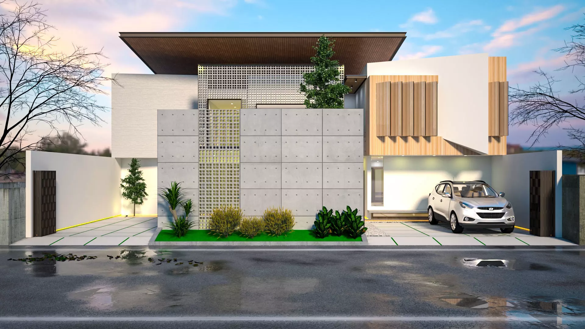 IB House is designed to have three functions, namely Residential, Office, and Boarding House. By having three building masses, the design that is carried is a contemporary style or a design that is currently up-to-date. When viewed from the front, the front of the building is used as a mini-office. Wall was designed as if it were a guardrail from the outside area with a concrete roster accent that can maximize air in and out of the room (cross ventilation). In the area to the right, it is used as the primary residence. While on the left, it is used as a boarding house with nine rooms with private bathrooms.The public zone in the residential house (project: IB House) has the concept of open space, living room, kitchen, and pool connected without solid insulation to create a more comprehensive impression. The combination of solid white wall materials and furniture with wood color makes the room brighter and cleaner. Following the character of the residents who want to create family activities that are thicker and more harmonious, the concept of open space is one of the tricks to realize this.