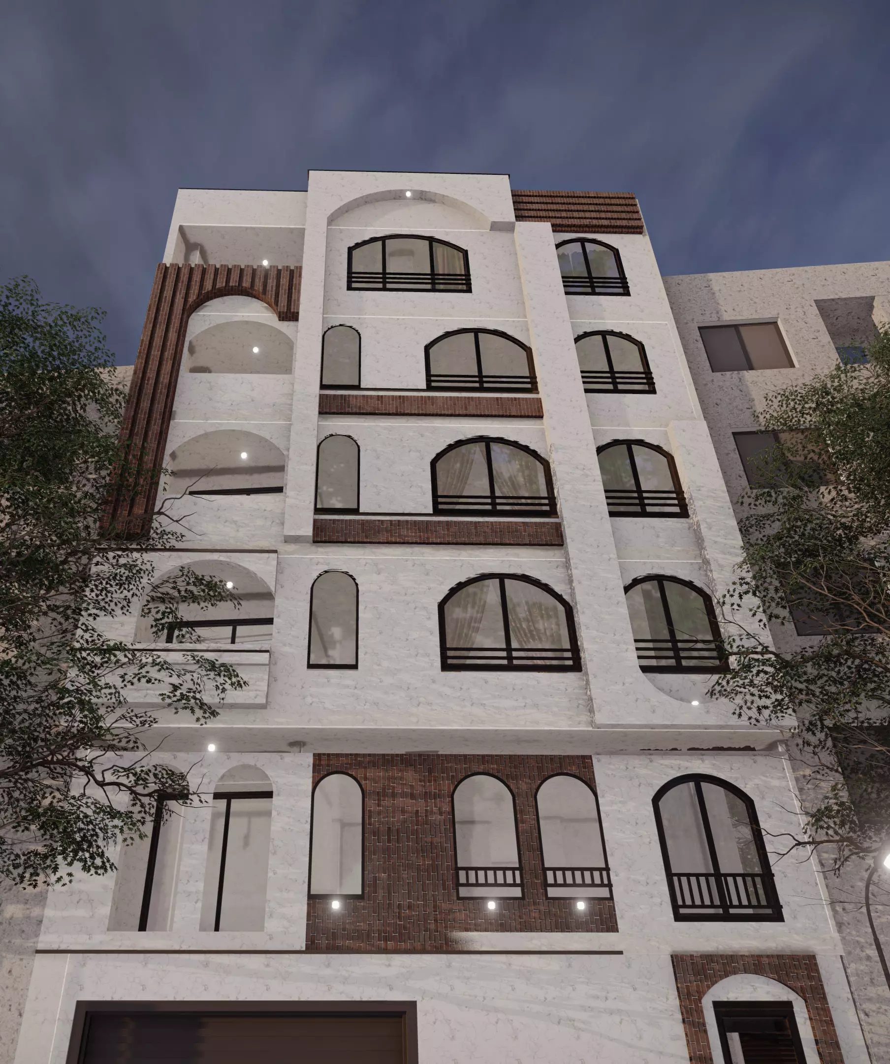 This is a complete modern facade design project for a 5-story residential building (plus ground floor). The façade is designed using a realistic mix of stone and brick materials, offering a contemporary and elegant look. This package includes detailed 3D models, architectural drawings, and day & night renders to visualize the concept in various lighting conditions.