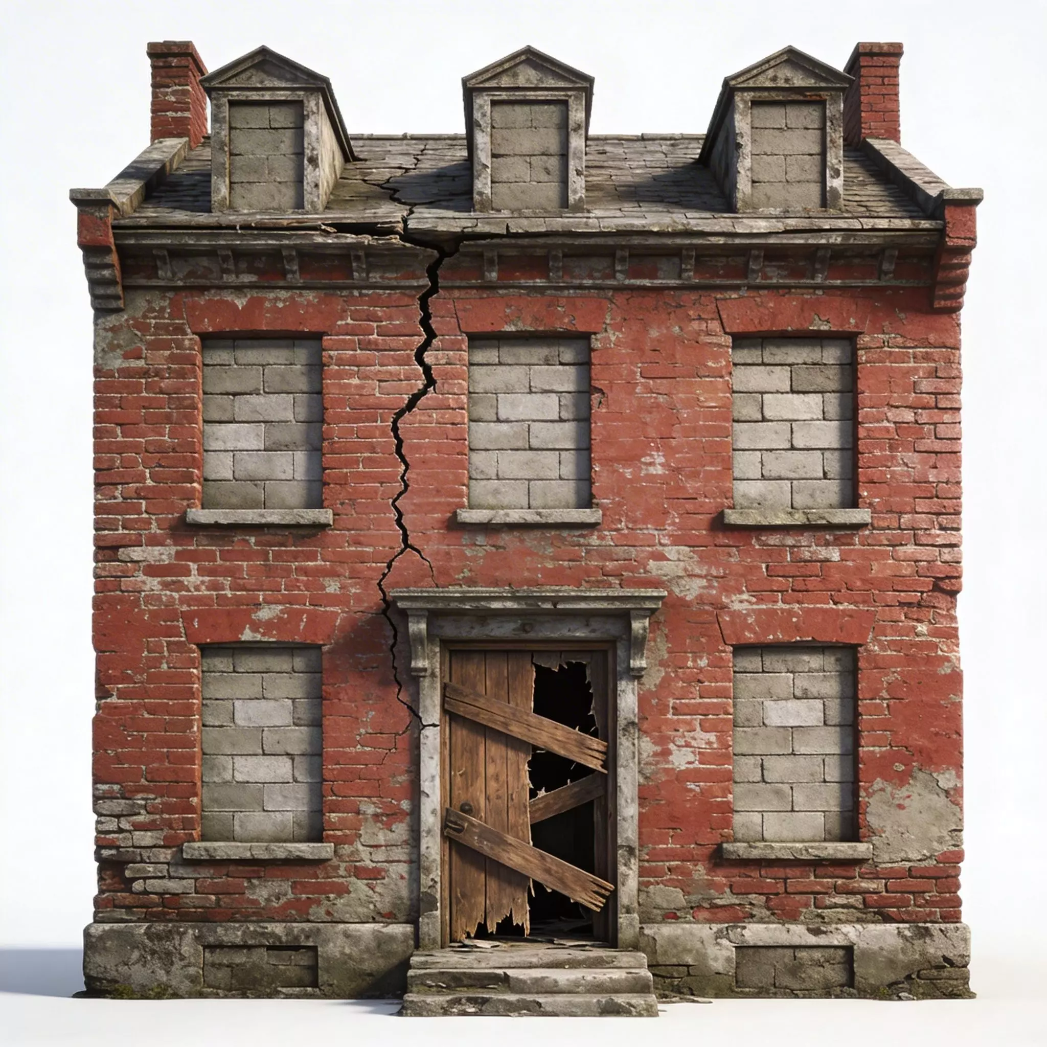 Sealed and Boarded ViewportsA primary feature of this model is the series of window frames that have been completely sealed with grey concrete blocks, emphasizing its status as a condemned structure. This is accompanied by a central wooden doorway that has been crudely boarded up with weathered, dark-tan planks, featuring significant splintering and structural failure to reinforce the asset's long-abandoned character.