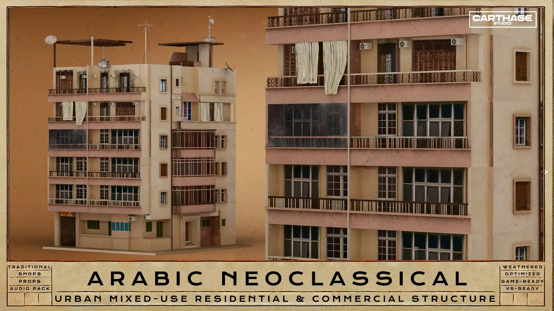 This high-quality 3D asset showcases a modern Arabic residential building with a unique combination of enclosed balconies, large windows, and ground-level commercial spaces. Designed with realism in mind, this model features rooftop water tanks, air conditioning units, and satellite dishes, capturing the authentic urban atmosphere of Middle Eastern architecture. The weathered PBR textures and optimized topology make it ideal for real-time applications in Unity, Unreal Engine, or cinematic projects. Whether for games, films, this asset is a perfect addition to a Middle Eastern cityscape.