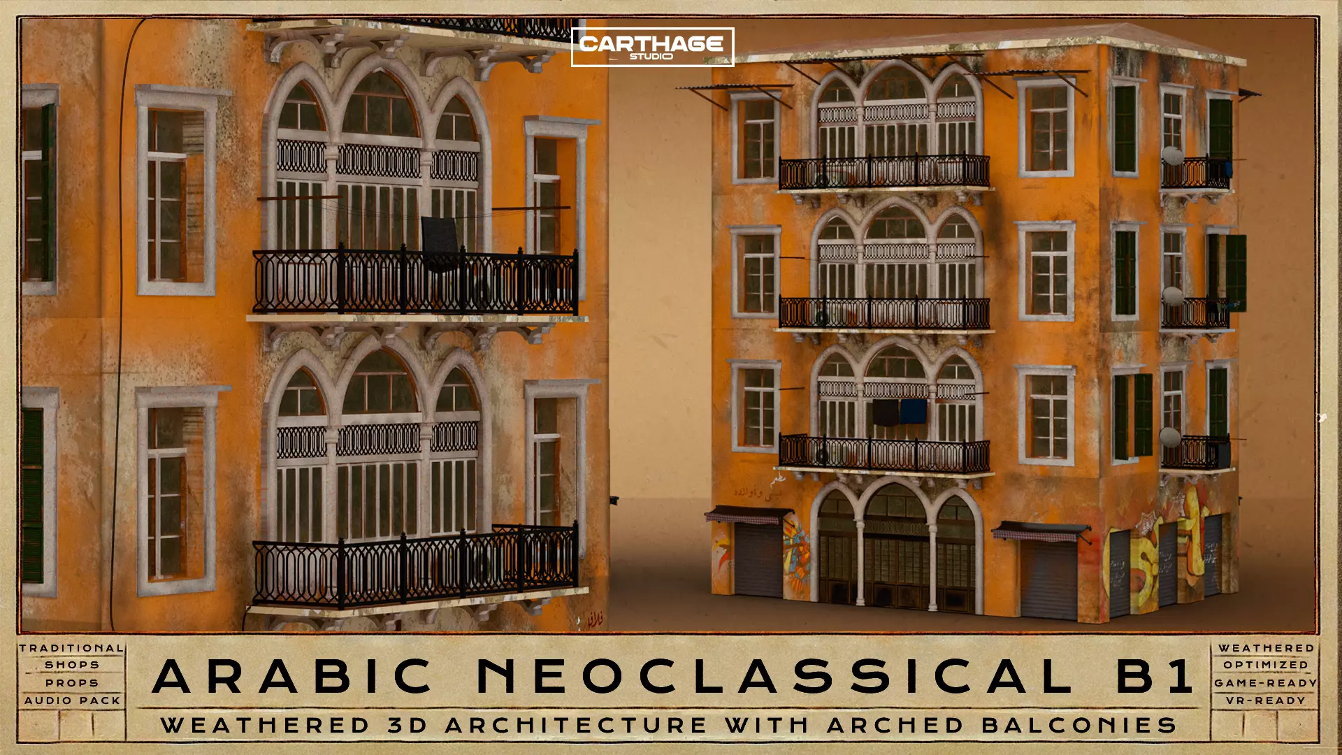 This high-quality 3D building asset showcases a classic Arabic neoclassical design, featuring arched windows, ornate balconies, and realistically weathered textures. The first floor boasts authentic Arabic writing and subtle graffiti, adding a unique cultural flair. Perfect for game developers, environment artists, and filmmakers seeking an authentic Middle Eastern architectural element, this model is optimized with PBR materials and clean topology or cinematic scenes. Add historical charm and urban realism to your project with this meticulously crafted structure.