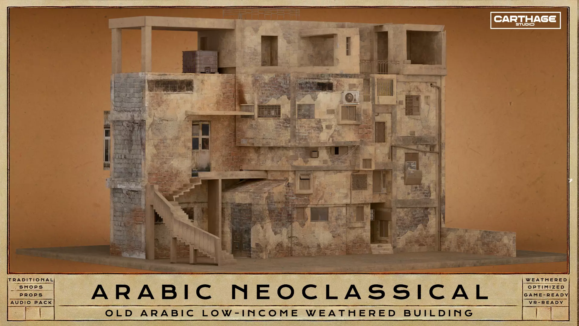 This high-quality 3D asset represents an old, low-income Arabic residential building with a heavily weathered and patched-up facade. The structure features exposed bricks, faded plaster, makeshift repairs, and an external staircase, capturing the authentic feel of aging urban environments. With open-air rooftop spaces and scattered air conditioning units, this model is perfect for adding realism to Middle Eastern cityscapes. The asset is optimized with PBR textures and efficient topology, making it ideal for real-time applications in Unity, Unreal Engine, or cinematic productions.