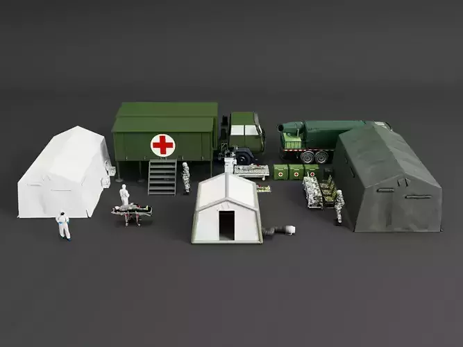 High-quality 3D model pack of a complete military field hospital setup: large and small medical tents (with red cross markings and entry flaps), ambulance truck with trailer, cargo truck loaded with supplies, stretcher beds with wounded figures, medical personnel in protective suits and camo uniforms, operating tables, IV stands, crates, generators, hoses, and scattered medical props. Detailed textures for canvas fabric, metal, camo patterns, dirt, and red cross symbols. Low to mid-poly optimized for performance, modular components for easy camp assembly. Perfect for military simulations, war games, rescue scenarios, FPS/RTS environments, historical/modern military recreations, renders, or VR medical base scenes.Software: Originally modeled in 3ds MaxRender: Ready for high-quality renders (V-Ray/Arnold/Corona compatible)File Formats Included: OBJ / FBX / 3DSPolygons: Low to mid-poly optimized for games and real-time useTextures: Included (check files for details)Scale: Real-world scaleSuitable for: Military medical scenes, field hospital environments, game assets, Unity/Unreal projects, wargaming terrain, concept artComplete modular assets for realistic army medic and field hospital setups!