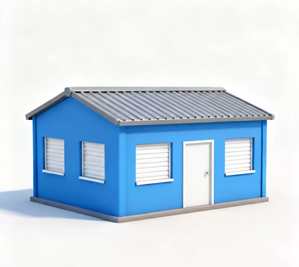 Solid Blue and Grey FinishThe house is finished in a uniform, matte bright-blue plaster for the main walls, providing a vibrant and cheerful aesthetic. This is contrasted by a solid grey corrugated roof and a neutral-toned base, emphasizing the building's simple geometric proportions and maintaining a professional, cartoonish art style.