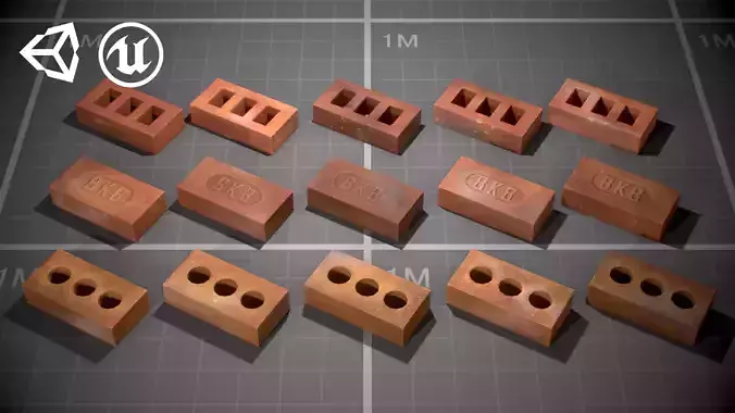 • 3 different bricks with 5 texture variations each , poly-count 5: 72, 5: 12 and 5: 170 triangles .