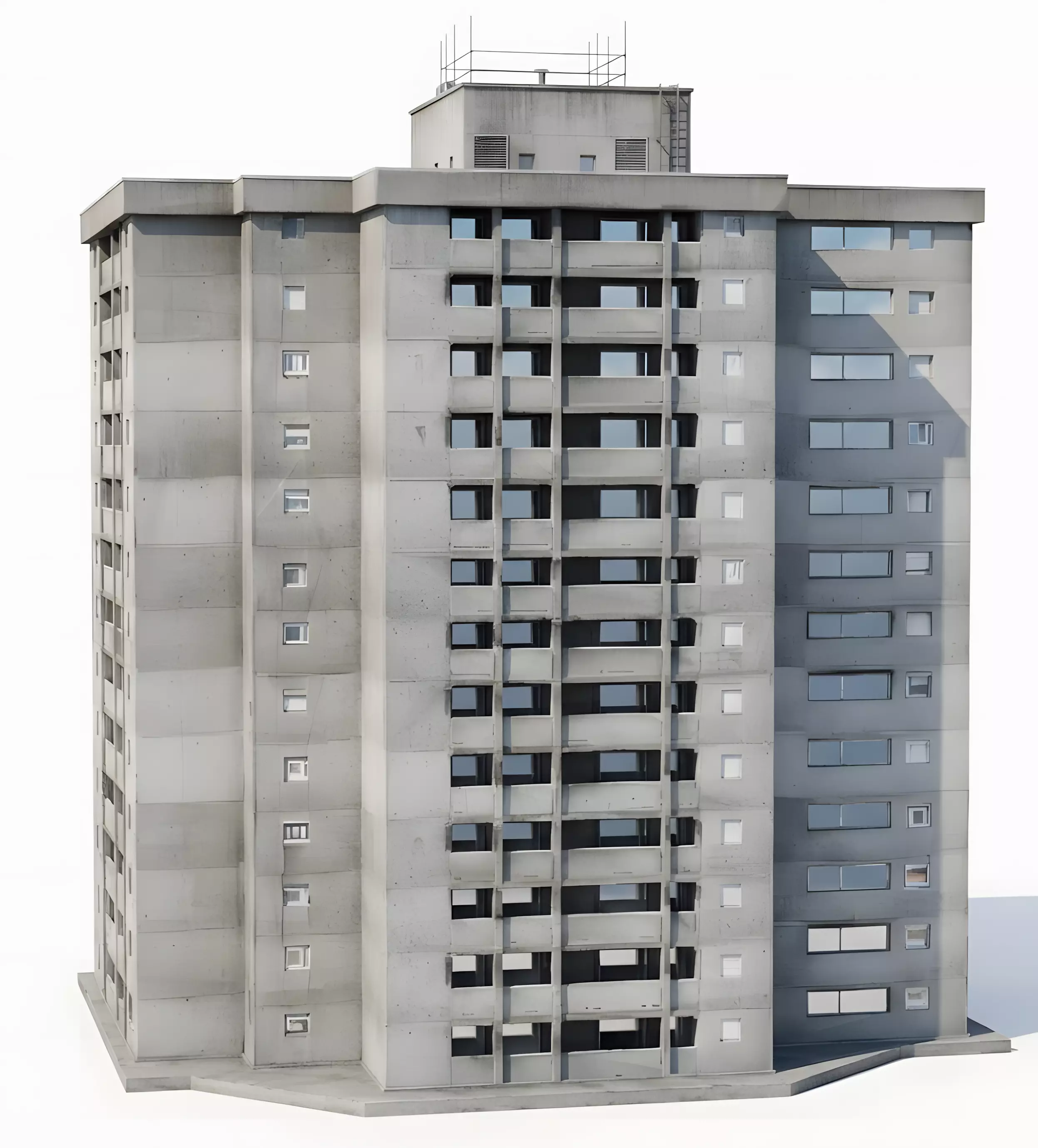 The Overall Concept This asset is a tall, multi-story residential building designed in the Brutalist style. It represents a classic high-rise apartment block or public housing tower, often found in European cities or Soviet-era environments.