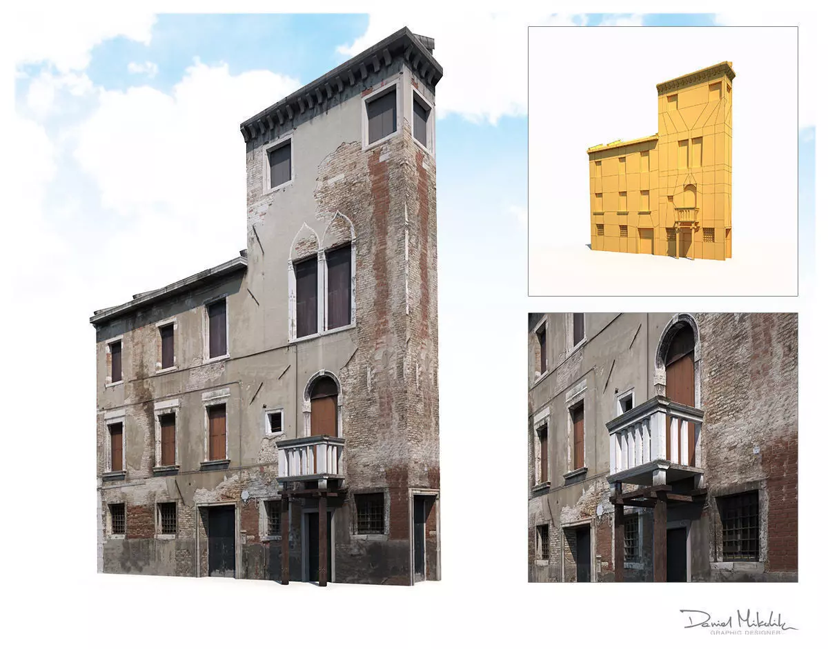 A 3D model of a low poly old building facade. Exterior only, no interior.