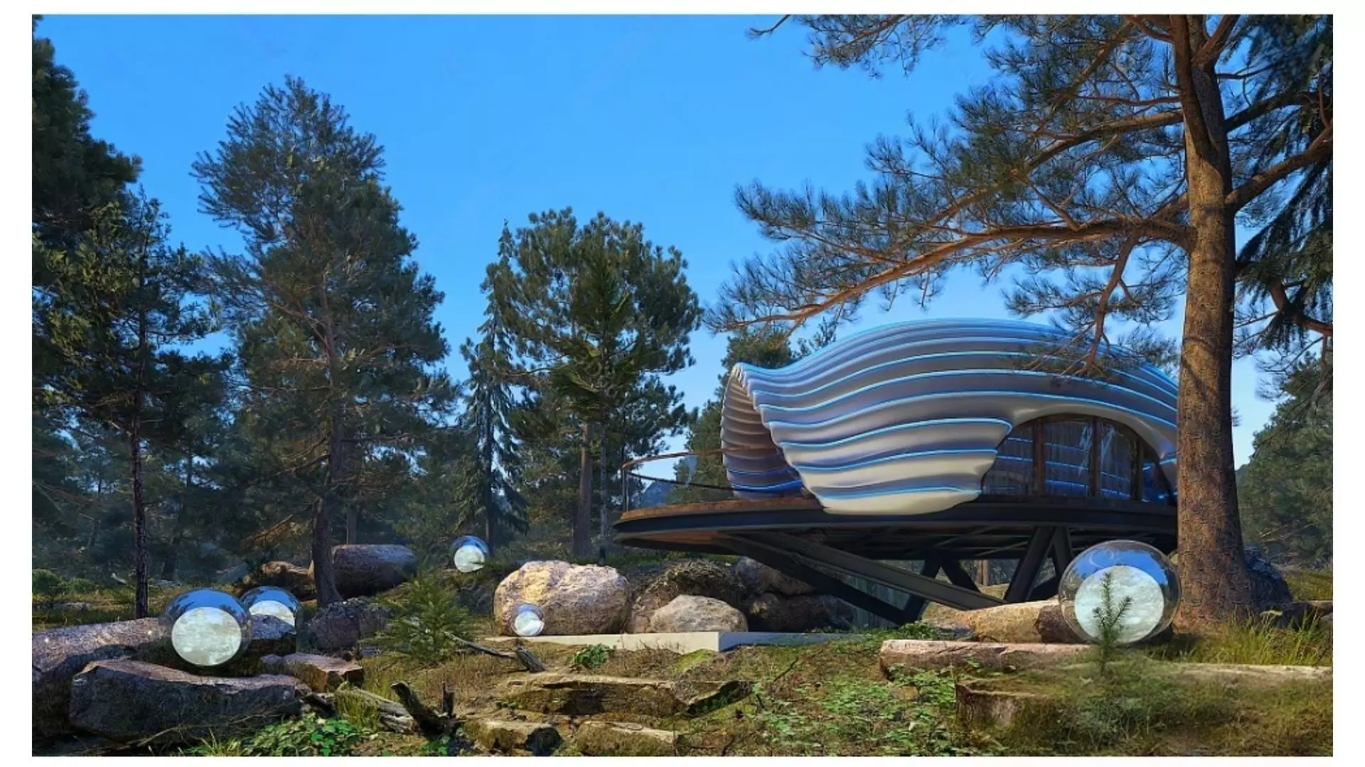 This is a highly futuristic forest building, featuring a streamlined wavy exterior design. With its silver-and-blue color scheme, it exudes a strong sense of technology. The building is erected on a steel-structured base among the woods, seamlessly integrating with the surrounding natural environment of pine trees and rocks. Transparent, glowing spherical installations are scattered on the ground, adding a magical atmosphere to this forest scene. On the whole, it embodies a design concept that perfectly combines advanced architectural technology with natural ecology. It is like a residential space descending into the forest from the future—showcasing both respect for the natural environment and a demonstration of cutting-edge architectural aesthetics and a sense of technology.