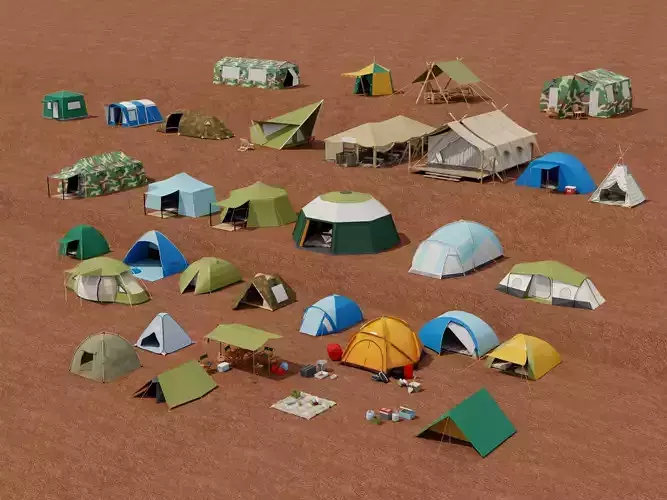 Massive high-quality 3D model pack of diverse camping tents: over 20 variations including military camo tents, classic A-frame and dome tents, colorful glamping tents, tipi styles, green canvas shelters, and unique shapes with accessories like chairs, coolers, campfires, picnic setups, and ground details. Features sandy desert terrain base, vibrant colors, realistic fabric folds, poles, and low-poly optimization. Modular and game-ready for easy scene building. Perfect for outdoor survival games, camping simulations, adventure environments, festival scenes, renders, VR, Unity/Unreal projects, or concept art.Software: Originally modeled in 3ds MaxRender: Ready for high-quality renders (V-Ray/Arnold/Corona compatible)File Formats Included: OBJ / FBX / 3DSPolygons: Low to mid-poly optimized for games and real-time useTextures: Included (check files for details)Scale: Real-world scaleSuitable for: Camping scenes, desert camp environments, game assets, Unity/Unreal projects, survival adventures, concept artUltimate variety tent mega-pack for immersive outdoor and camping setups!
