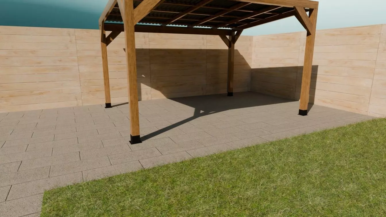 Model of a douglas wooden canopy. There is also a fence, a pavement and a piece of a grass lawn in the scene