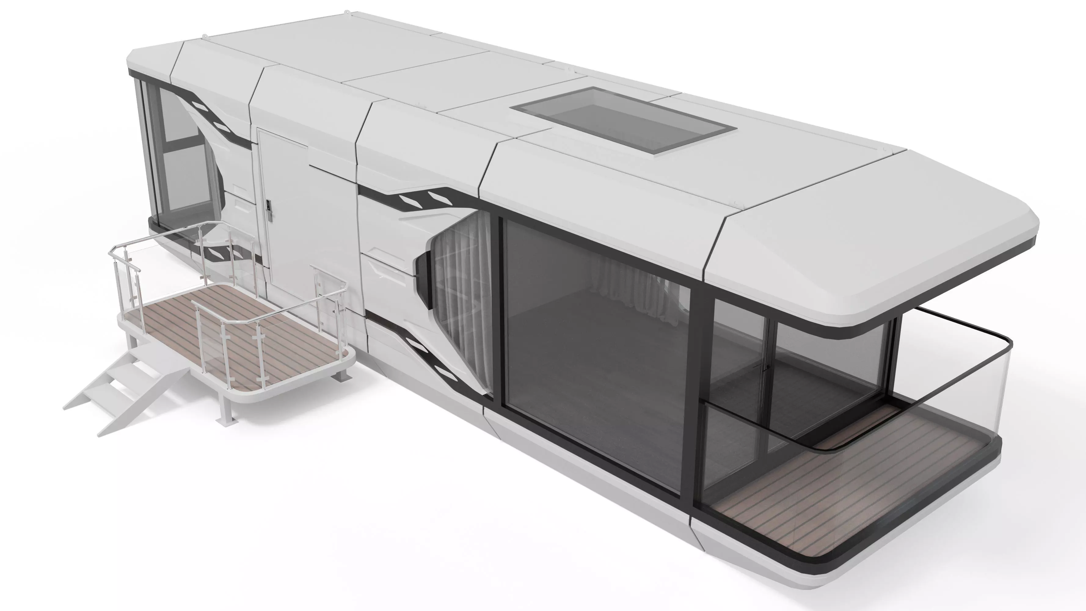 - Exterior finish: White glossy metal for a sleek, modern look. Black trim and window frames provide contrast and style.