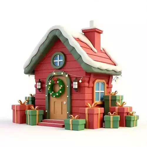 A high quality 3D model of a festive gingerbread house, designed for professional use in holiday-themed games, virtual environments, and digital art. The model features a charming stylized aesthetic with candy cane pillars, frosting details, and seasonal wreaths. Please note that this model is not rigged. It is prepared for immediate integration into your preferred rendering engine or 3D software.