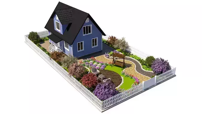 • House: A classic two-story home with a blue siding, white trim, and a dark shingled roof. The design includes a front porch, multiple windows, and a chimney, offering a quintessential residential feel.• Landscaped Garden: The surrounding garden is the highlight of this scene, designed to create a peaceful and inviting outdoor space. It features a manicured green lawn and curving pathways made of stone and gravel that guide you through the property.• Outdoor Living Areas: The garden includes a dedicated seating area with three modern chairs and a small table on a wooden deck, ideal for social gatherings. Nearby, a charming wooden swing bench provides a perfect spot for relaxation.• Diverse Foliage: The landscape is rich with a variety of colorful plants and trees, including vibrant purple, pink, and white flowering bushes, as well as a mix of mature and young trees with different foliage colors to create a natural, dynamic look.• Picket Fence: A classic white picket fence encloses the entire property, adding to its idyllic charm and providing a clear boundary for the scene.• High-Quality Textures and Models: This asset is designed with high-quality textures and geometry to ensure a realistic and visually appealing render from any angle, whether it's a top-down view or a perspective shot.
