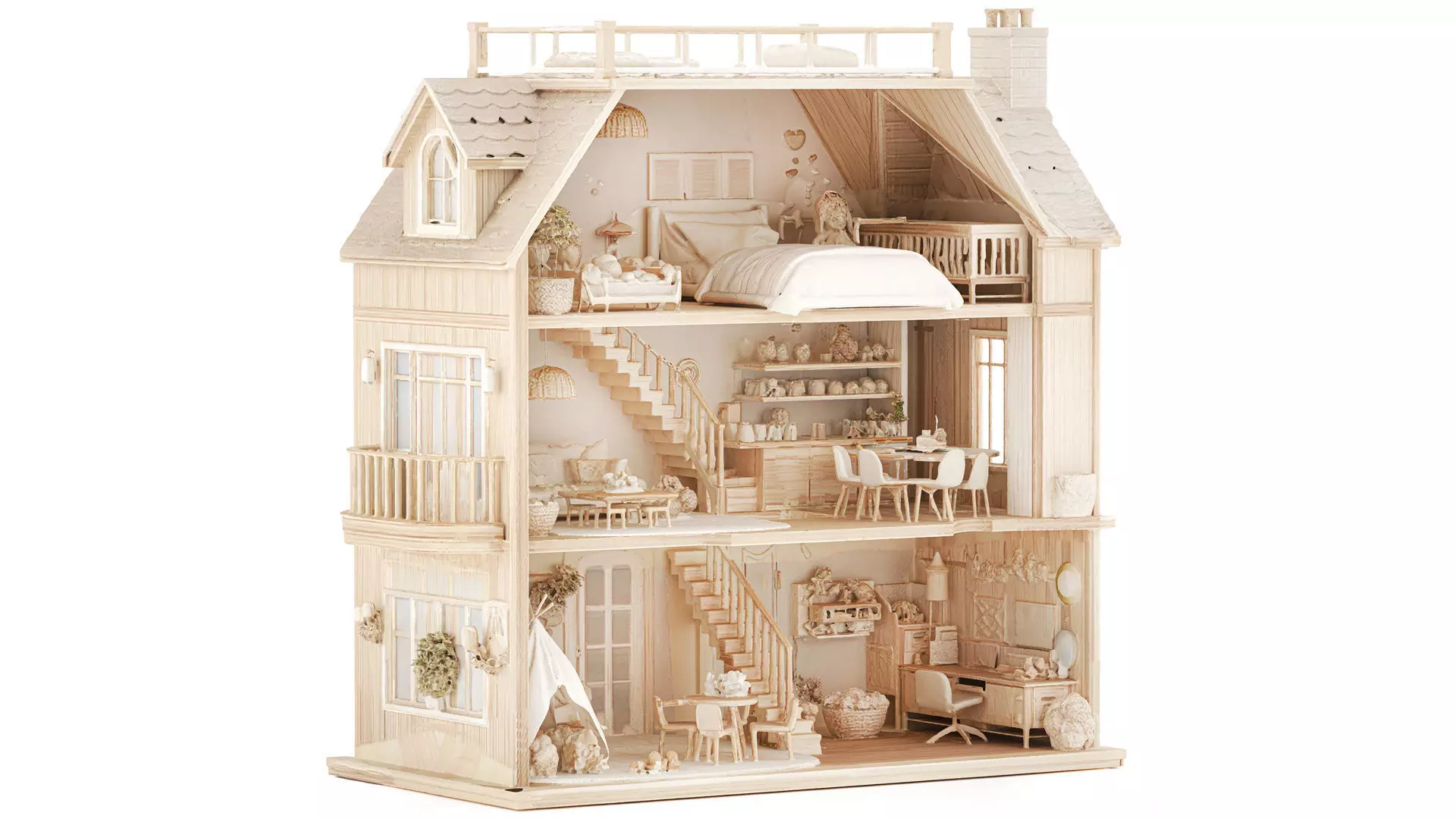 Children's toy Wooden Dollhouse with furniture and decor in pastel tones. Set of 5This children's toy is shaped like a fairytale princess dollhouse, decorated in soft pastel tones with accents of cream, beige, white, and off-white. The castle features multiple towers of varying heights with pointed roofs adorned with flags and gold decorative elements, giving it a classic fairytale look. The main entrance, with an arch and a clock above it, is located in the center of the composition, accessed by a staircase. A princess figurine in a long pink dress stands at the entrance, creating the feeling of a living fairytale scene. The castle's base is decorated with green decorative elements that imitate the landscape, adding realism and depth to the composition. The toy is highly detailed: windows, stone-effect walls, decorative patterns, and architectural elements are all detailed, giving it a three-dimensional, rich, and visually appealing look.Soothing pastel tones and colors. Material: wood, ceramic