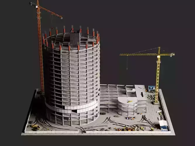 This detailed 3D model accurately recreates a modern circular high-rise construction site with authentic engineering details. Features a multi-level cylindrical tower under construction (exposed concrete slabs, rebar, formwork, upper platforms), main tower crane with hook and rigging, plus secondary lifting gear. Ground area includes temporary site office, material piles (pipes, lumber, concrete elements), vehicle tire tracks on dirt, perimeter fencing, and safety features.Real-world scale with PBR materials for high-quality renders. Ideal for architectural visualization, construction animations, BIM presentations, urban planning, real estate marketing, VR/AR, game environments, or professional reference. Rich details with good optimization, perfect for architects, animators, game developers, and visualization experts.Supported Formats:OBJ | 3DS | MAX | FBX | + Texture Pack (PBR: BaseColor, Normal, Roughness, Metallic, AO)