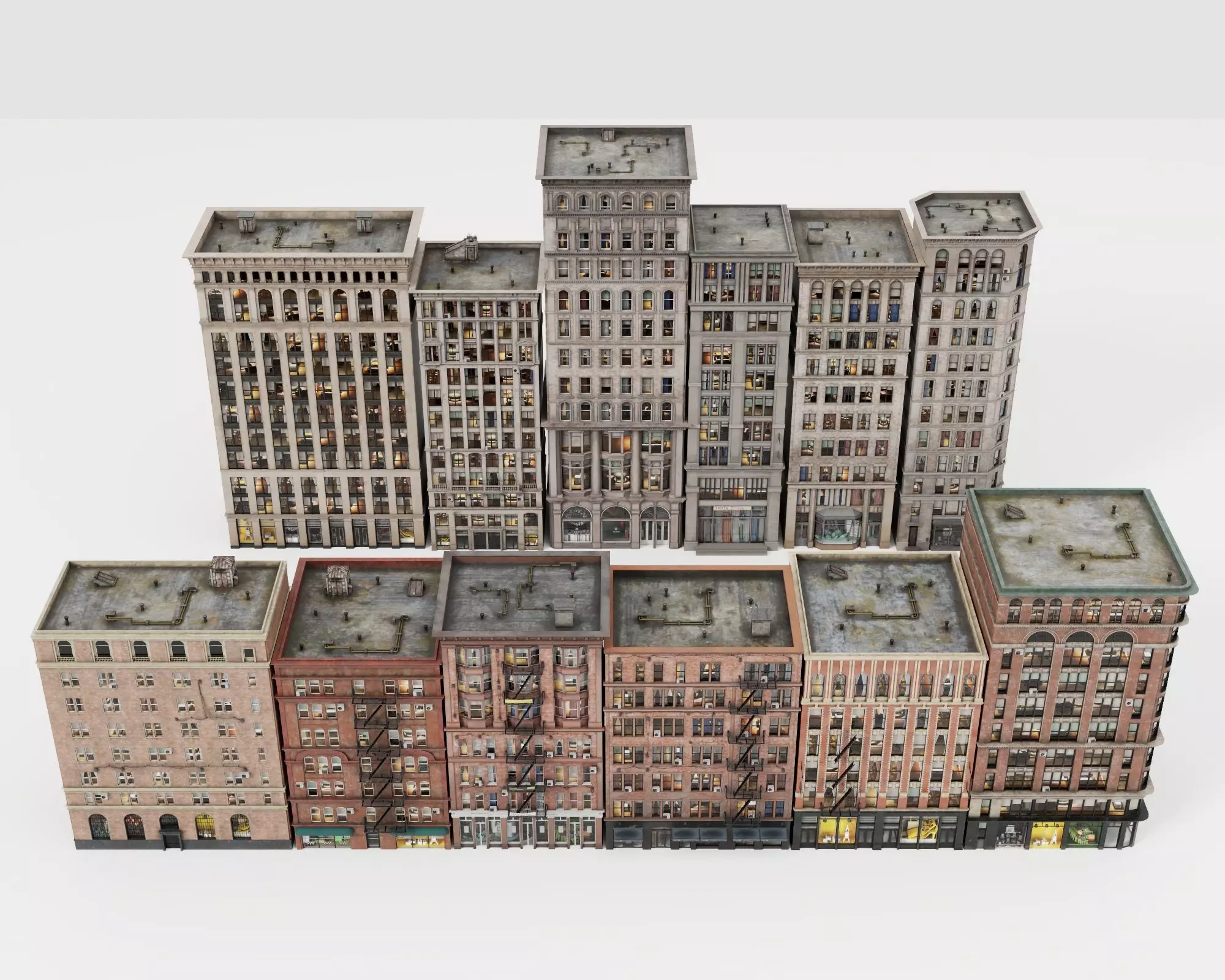 This premium 3D model collection features 15 unique mid-rise apartment buildings in classic European urban style, with ornate stone and brick facades, arched windows, balconies, cornices, rooftop chimneys, and illuminated windows for cozy night-time ambiance. Buildings vary in height and design, including elegant Haussmann-inspired structures and more traditional brick apartments with storefronts at street level. All models include detailed exteriors, weathered textures, and realistic lighting effects. Low-poly optimized with high-quality PBR materials and clean topology – ideal for building historic city streets in Paris, Berlin, or Vienna-inspired scenes. Perfect for architectural visualizations, game environments, animations, VR tours, or cinematic urban backdrops.