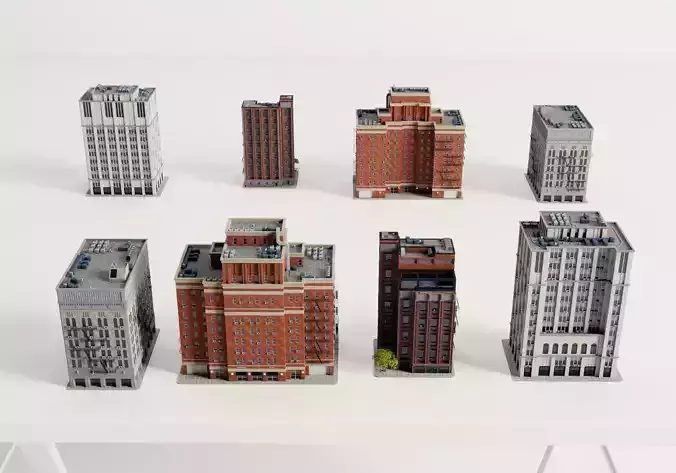 This high-quality 3D model pack contains 10 unique mid-rise apartment buildings inspired by classic American urban residential architecture, primarily featuring red brick facades, fire escapes, detailed windows, rooftop water towers, HVAC units, and ground-level storefronts or entrances. Styles vary from early 20th-century brick apartments to more modern interpretations with stone accents. All models include clean topology, realistic proportions, and detailed exteriors suitable for city block scenes. Ideal for urban visualizations, game environments (e.g., GTA-style cities), animations, VR/AR projects, architectural renders, or film backdrops. Low-poly optimized with high-resolution textures for efficient performance.