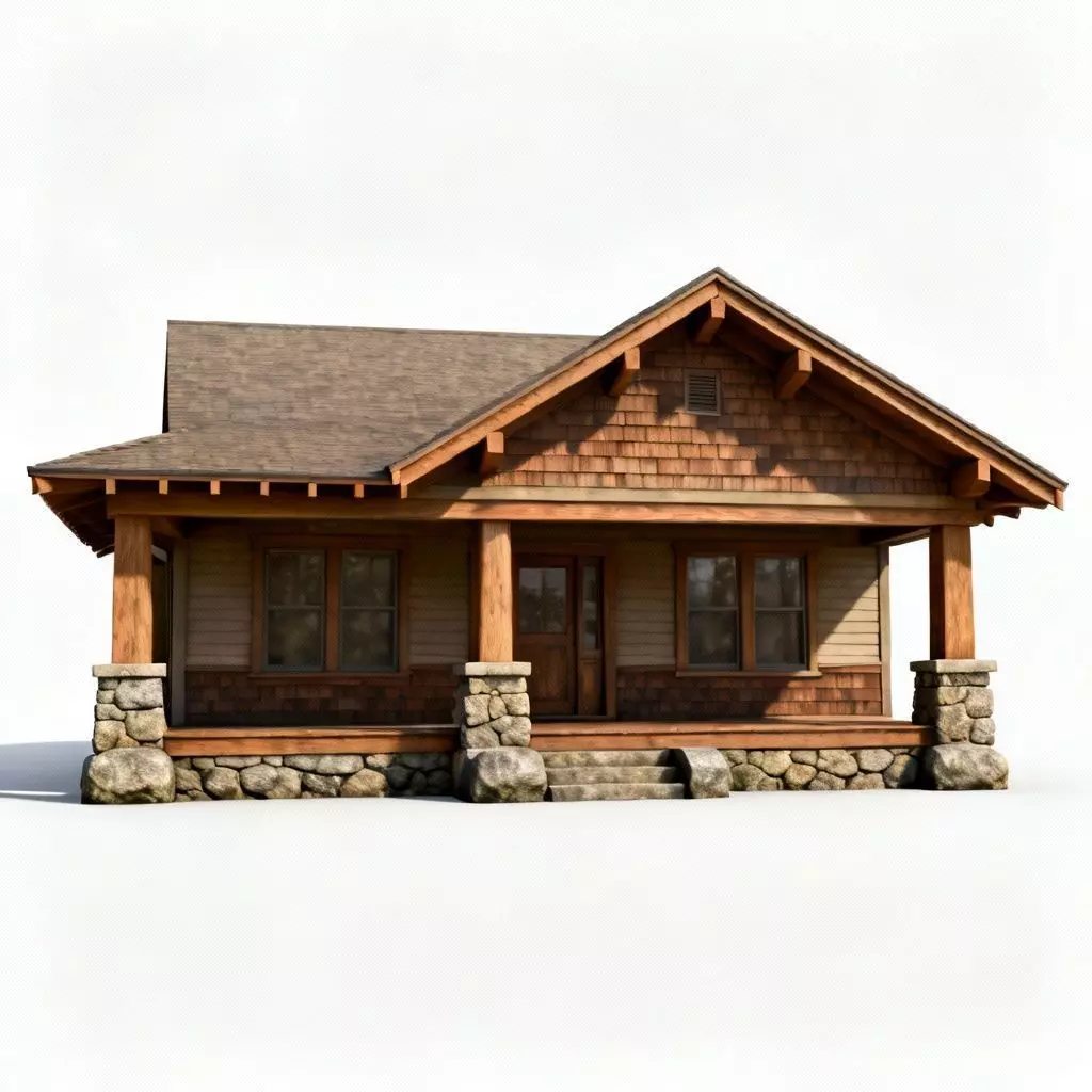 The Overall Concept This asset is a cozy, single-story house designed in the Craftsman Bungalow style. It represents the quintessential American suburban home from the 1920s or 30s, known for its handcrafted look and connection to nature.