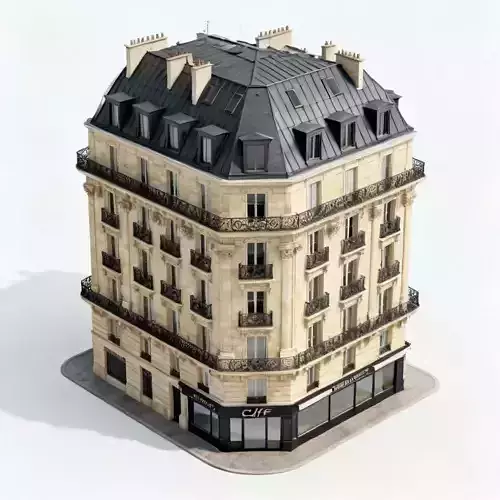 The Overall Concept This asset is a quintessential Haussmann-style building, the iconic architecture of Paris. It is a corner block designed to sit at the intersection of two streets, making it perfect for creating realistic European city centers.
