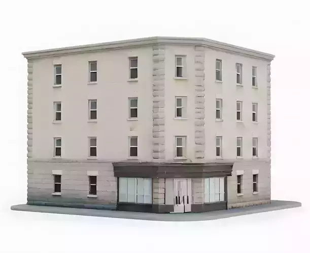 The Overall Concept This asset is a corner block building, specifically designed to fit on the corner of a street intersection. It features an L-shaped or angled footprint that allows it to face two different streets at the same time.