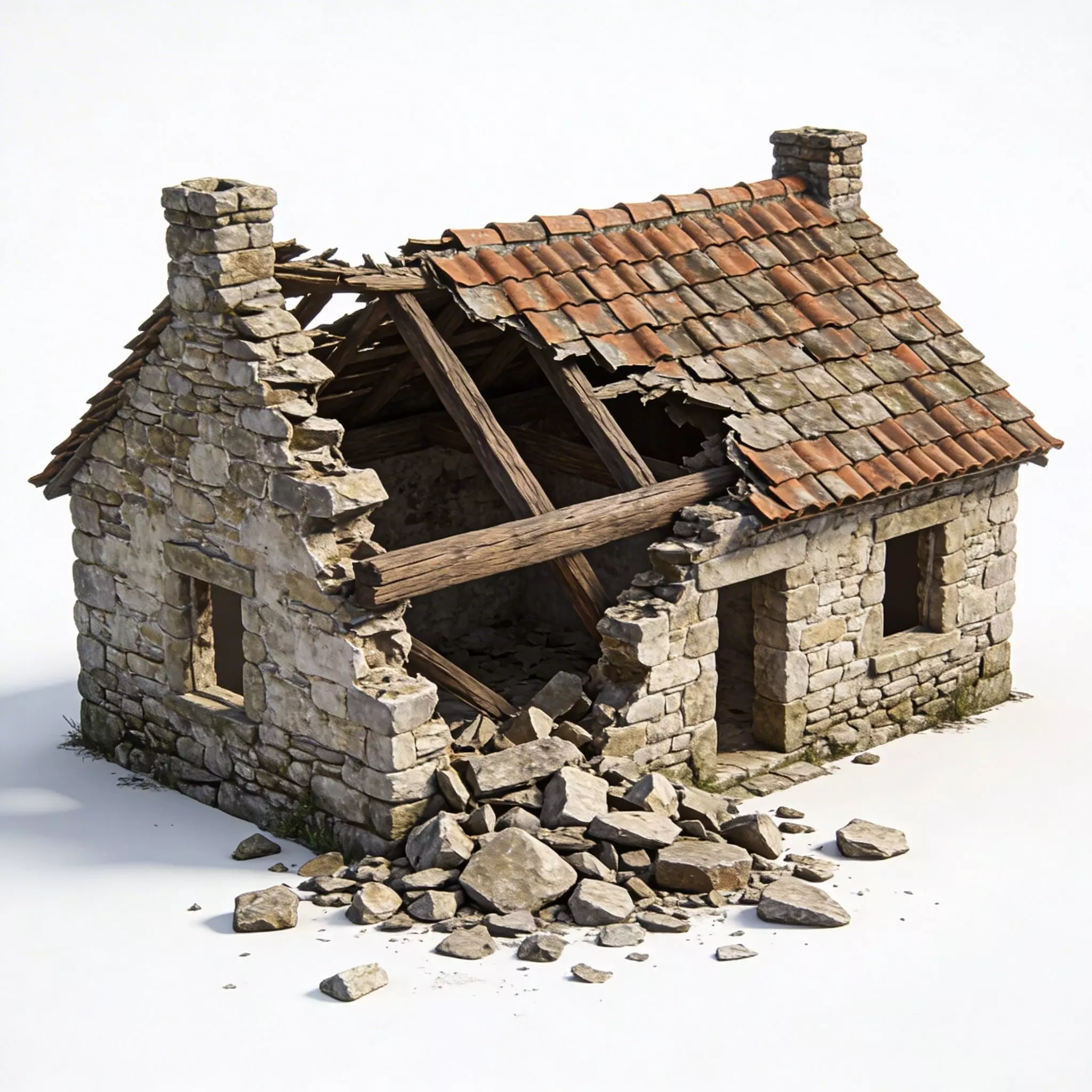 Asset BreakdownThe Overall ConceptThis asset is a highly detailed, 3D-modeled realistic stone cottage designed as a partially collapsed and ruined environmental prop. Diverging from stylized architecture, this model features life-like scale and authentic material textures, making it an ideal choice for historical RPGs, survival games, or as a primary landmark in realistic 3D environments.