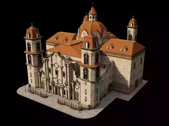 High-quality 3D model of a grand colonial Baroque church with twin bell towers, prominent central dome, orange terracotta tiled roof, clock on the facade, and ornate stone details. Features symmetrical layout, arched windows, bells in towers, crosses, benches around the base, and warm lighting accents. Captures the majestic essence of Latin American colonial architecture (inspired by historic missions and cathedrals in Mexico, Peru, Ecuador regions). Ideal for architectural visualization, historical scenes, renders, games, VR, dioramas, or cityscape environments.Software: Originally modeled in 3ds MaxRender: Ready for high-quality renders (V-Ray/Arnold/Corona compatible)File Formats Included: OBJ / FBX / 3DSPolygons: High-poly for detailed close-ups and architectural accuracyTextures: Included where applicable (check files)Scale: Real-world scaleSuitable for: Latin American colonial scenes, historic recreations, church exteriors, religious architecture projects, film/VFX, 3D printingA stunning landmark model for collectors of world religious buildings!