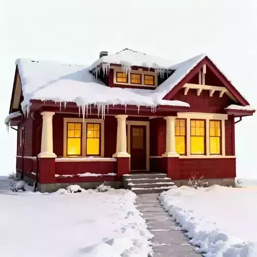 Iconic Porch Columns The house features thick, tapered columns that sit on heavy brick piers, a signature style of Craftsman architecture. These sturdy pillars support the snow-covered porch roof, providing a sheltered entrance for characters.