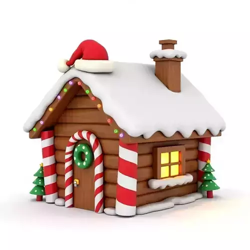 A high quality 3D model of a cozy winter log cabin, perfect for seasonal environments, holiday animations, and game design. The model captures a warm holiday atmosphere with heavy snow-covered roofs, realistic log textures, and glowing windows, often accompanied by festive pine trees. Please note that this model is not rigged. It is designed for easy use and quick setup in any 3D environment or project.