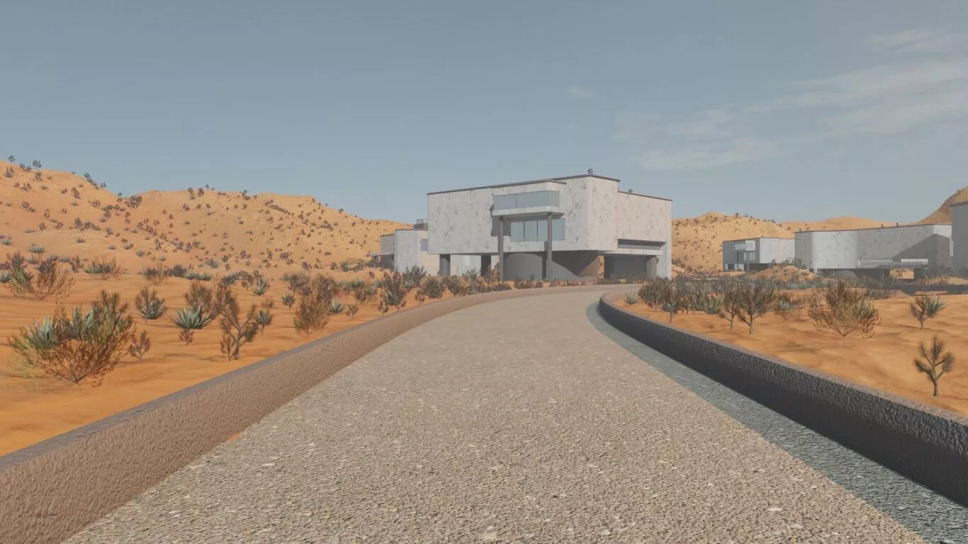 Notable assets include modern houses, desert terrain, winding roads, complemented by fine touches: flat roofs, large windows, elevated structures. Ready for game engines, real-time rendering, and enterprise AI pipelines building synthetic environment datasets.