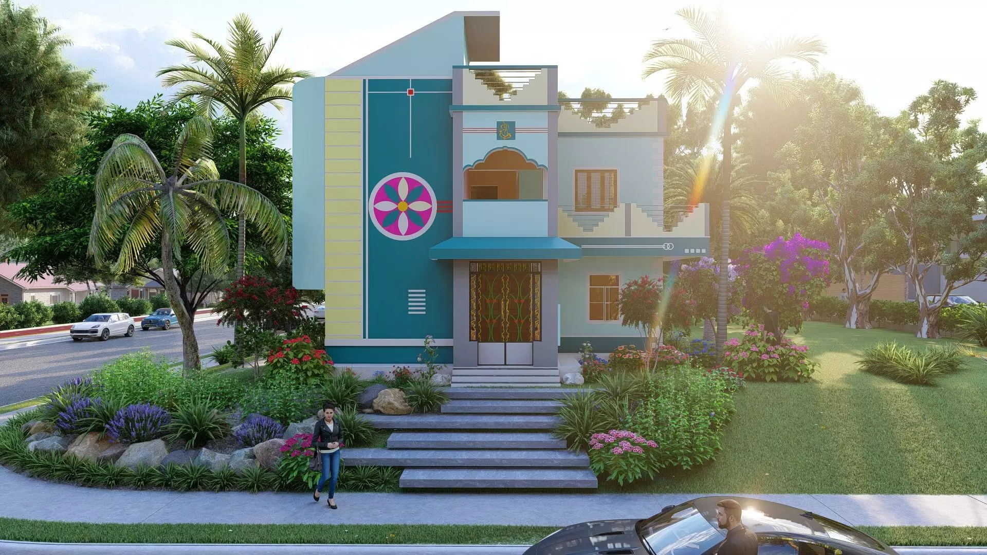 Front elevation detailingBalcony with traditional railingsCompound wall with gateArchitectural ornamentation (pillars, motifs, jaali)Separate floors (ground + first floor)Indian-style windows and doorsFully textured and render-ready