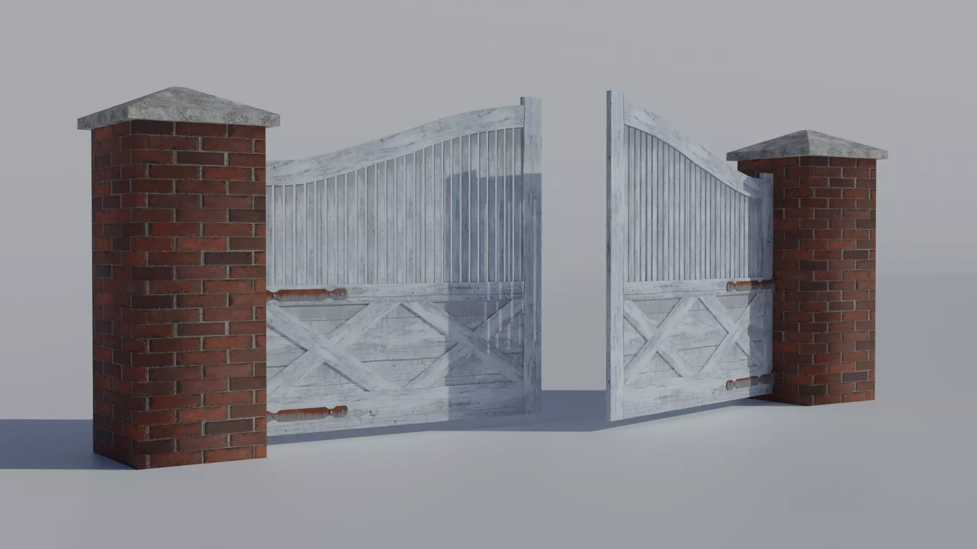 • A wooden driveway entrance gate with brick pilars and metal rusty hinges.