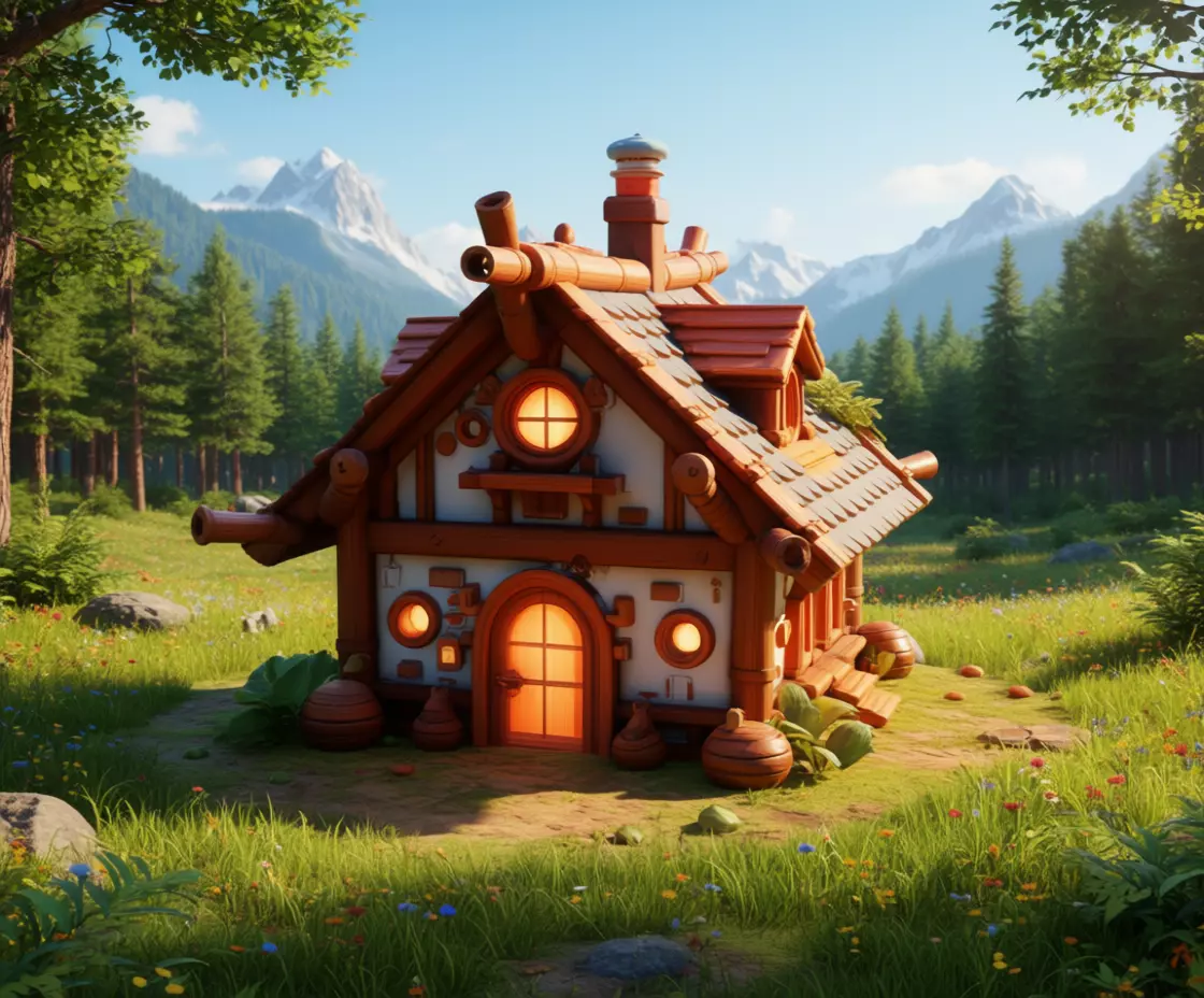 The cottage itself is a masterpiece of stylized fantasy architecture, blending rustic charm with cartoonish exaggeration to create an instantly iconic structure. Its frame is built from hand-hewn timber logs, each rendered with photorealistic wood grain, subtle weathering, and natural imperfections — knots, cracks, and mossy patches — that suggest age, care, and character. The roof is a cascade of rich terracotta shingles, layered with depth and texture, crowned by a whimsical chimney with a rounded cap and decorative pipe details. Ornate wooden beams and carved brackets frame every edge, while round porthole windows glow warmly from within, casting a golden light that dances on the surrounding grass — hinting at warmth, safety, and mystery inside.